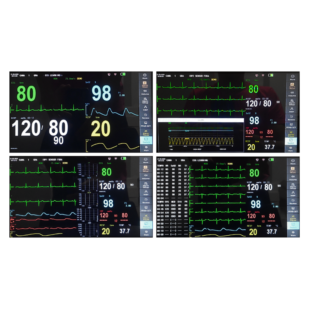 Tela HD LED: Clareza visual avançada com a tela de 10.1 polegadas, facilitando a leitura dos dados e a análise dos sinais vitais, com opcional de touch-screen.