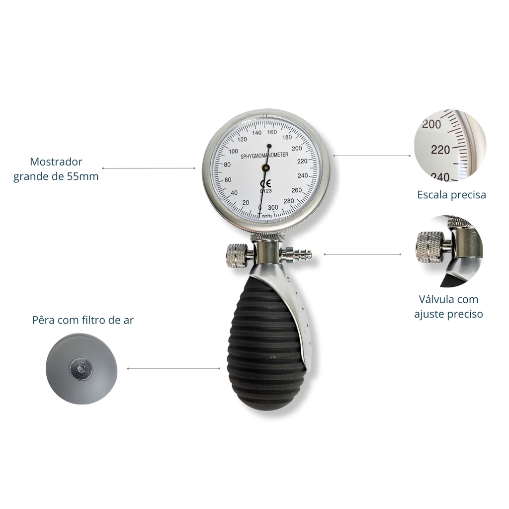 - Material: Corpo metálico niquelado, visor em acrílico, pêra PVC