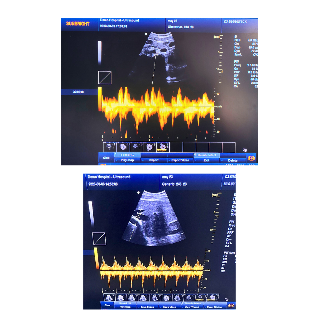 Doppler profissional: PW com Auto Trace, Doppler direcional, Duplex e Triplex para avaliações vasculares e cardíacas detalhadas.